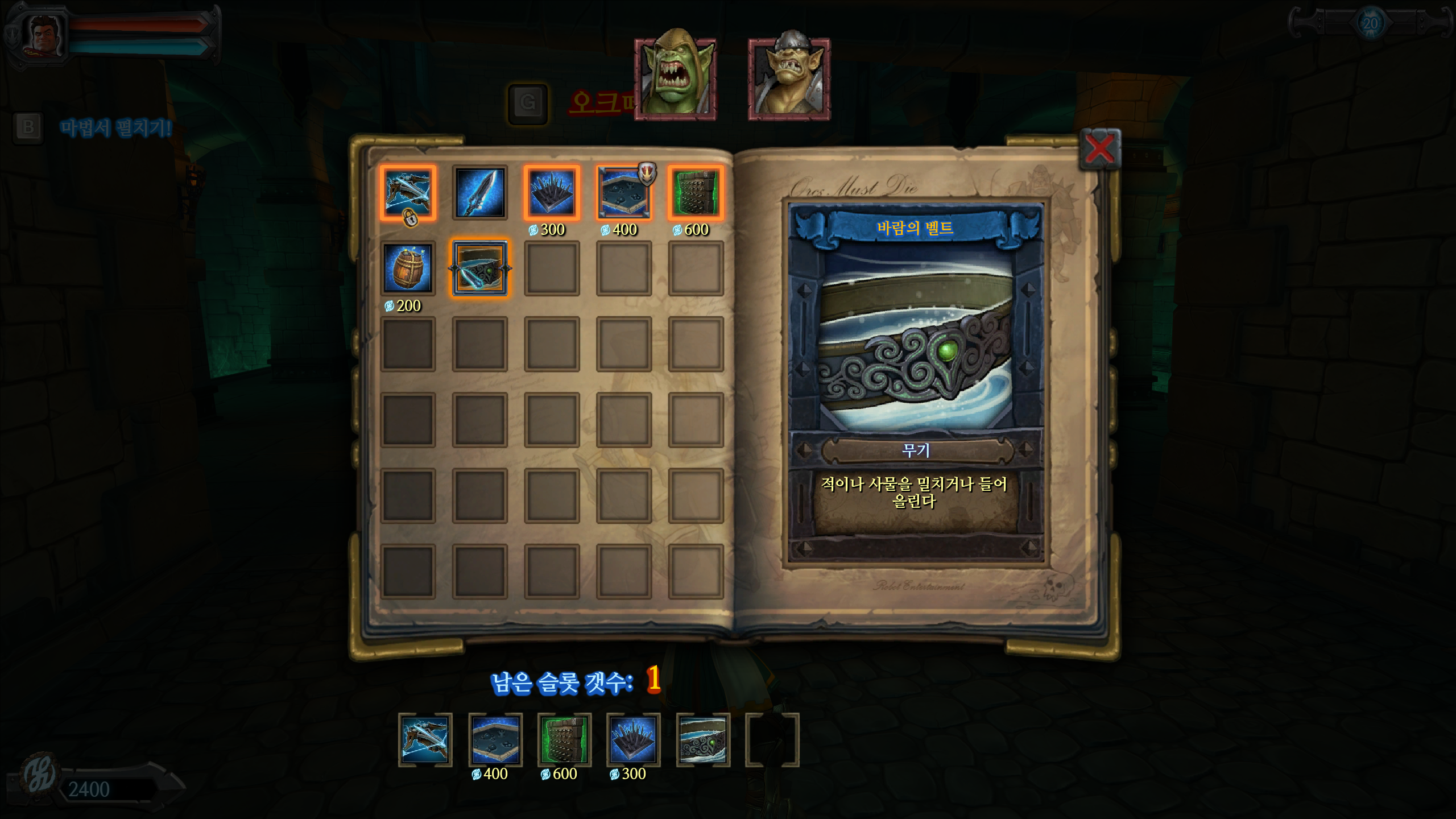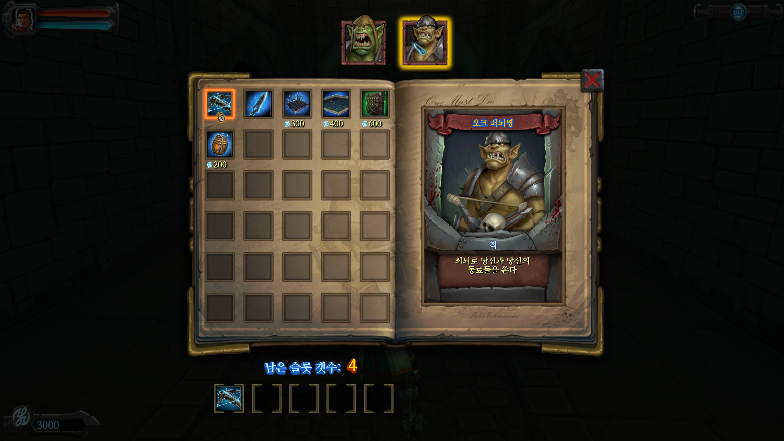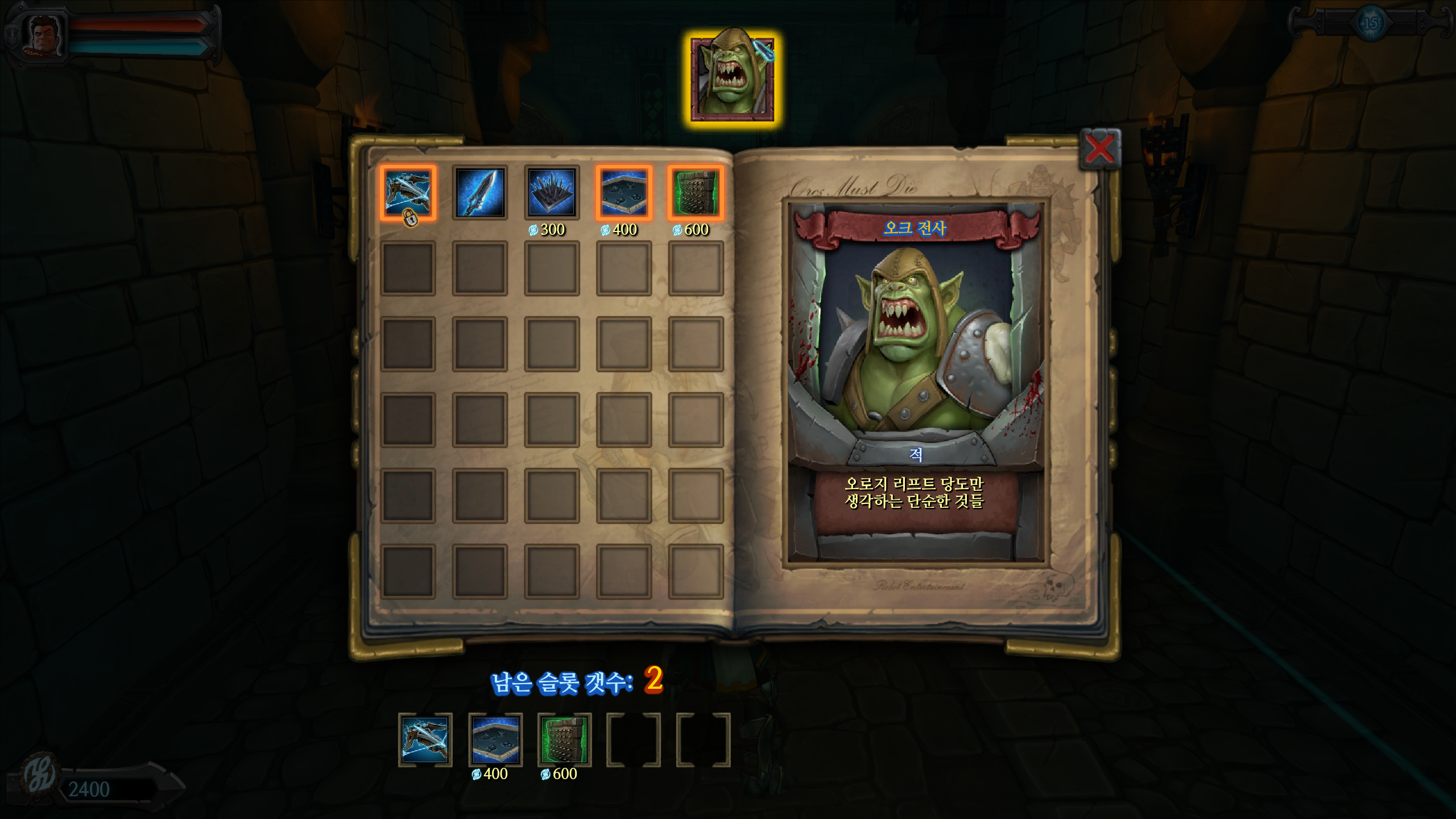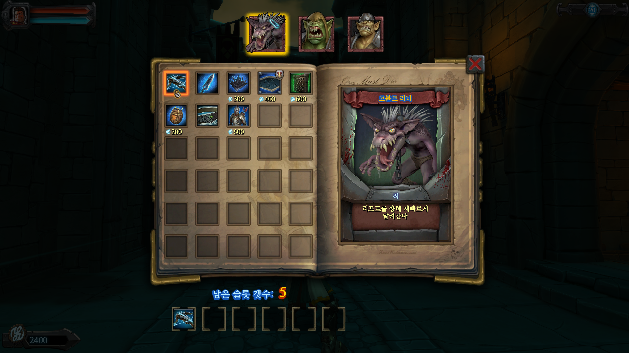 무기인 석궁은 헤드샷이 가능하다. 오크들이 미친듯이 달리기 때문에 노리고 헤드샷을 쓰기는 어렵지만 적들도 무더기로 나오기 때문에 머리가 있을만한 높이에 툭툭 쏴 주면 50%정도는 헤드샷이 뜬다.