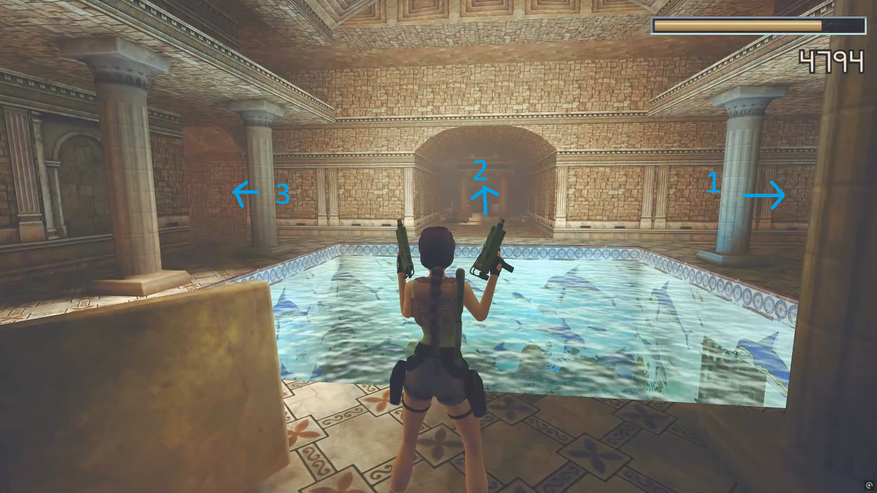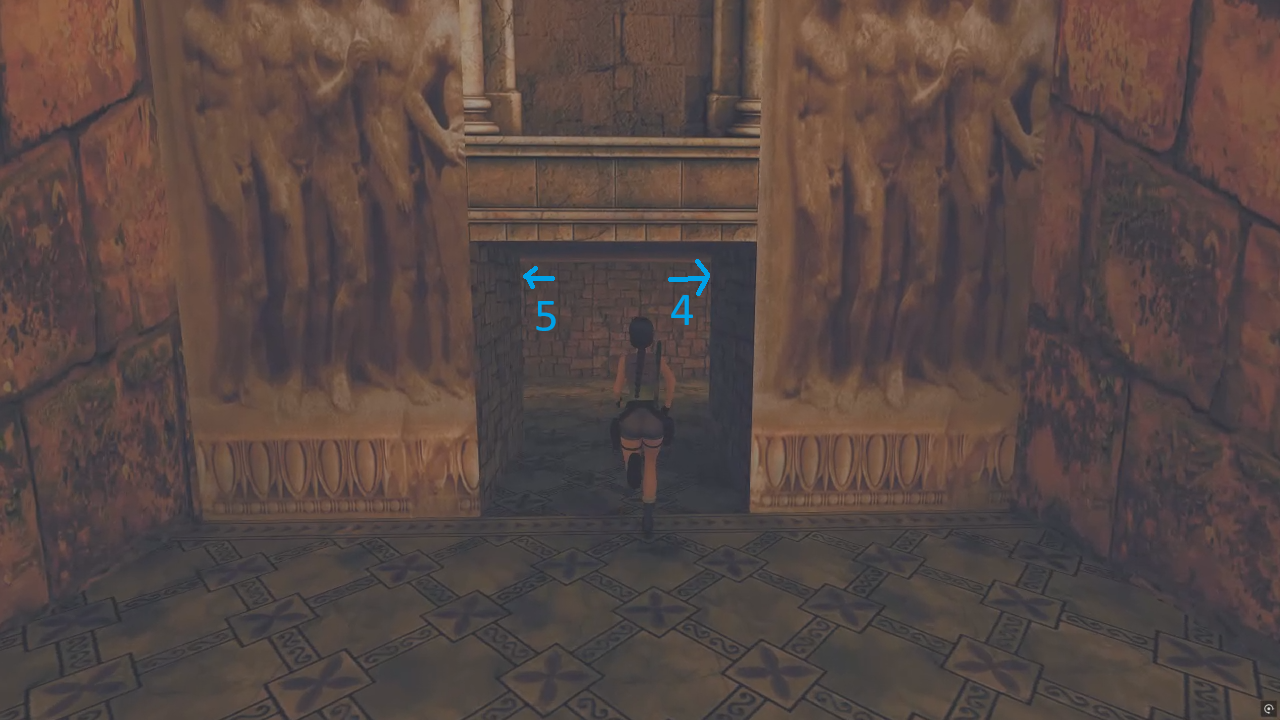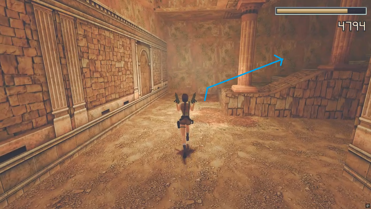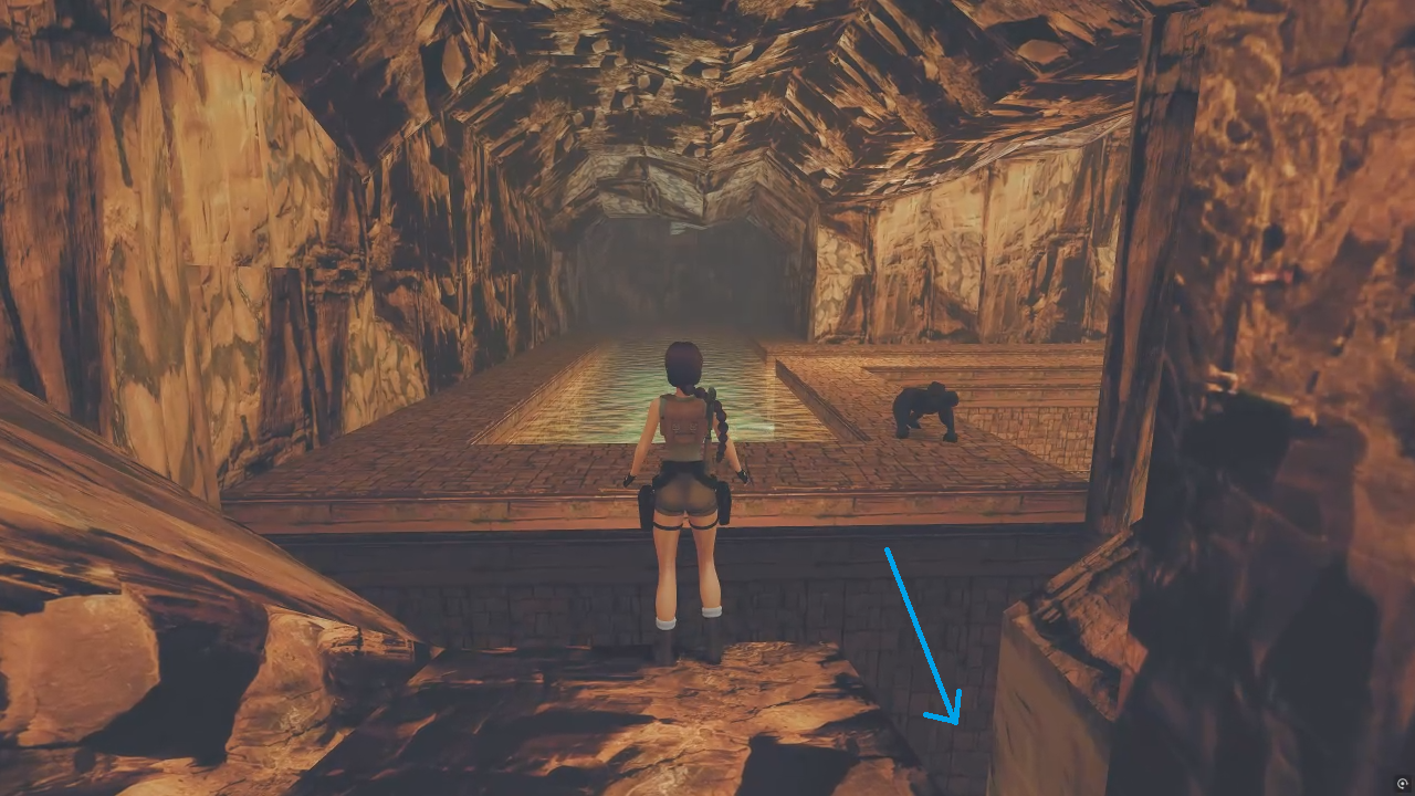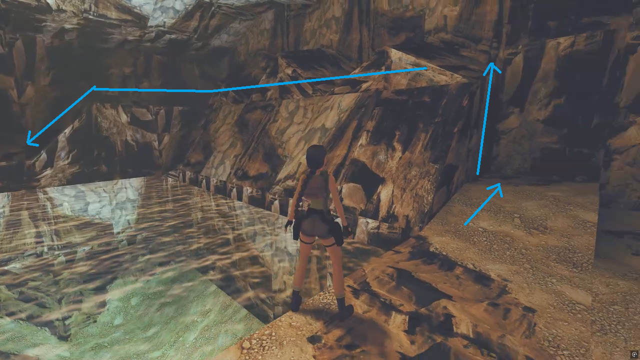 반대편으로 건너가 위로 올라가면 수로가 있는 방이 나온다. 가야 할 곳은 그 아래층이다. 내려가기 전에 수로를 헤엄쳐 가면 약간의 트릭이 있는 비밀 장소가 나온다.