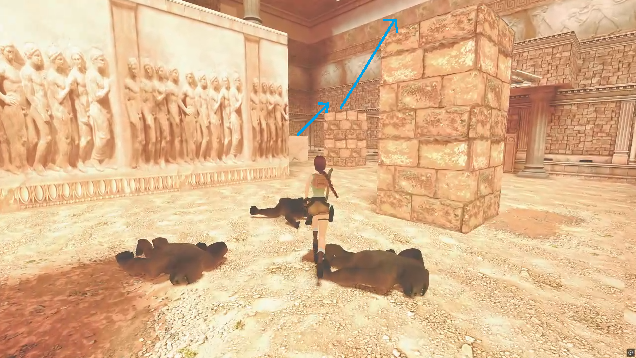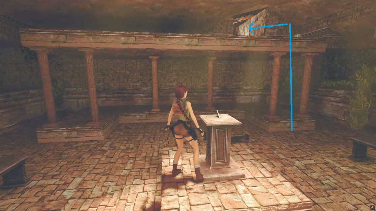 내려가면 색이 다른 벽이 하나 있는데 그 벽은 사실 이전의 방에 서 있던 기둥의 밑둥이다. 잡아서 당기면 기둥이 부서지며 큰 소리가 난다. 이제 5번 방향 올라가는 길로 가면 기둥이 부서져 있는걸 볼 수 있다. 그리고 부서진 기둥 위로 올라가야함을 눈치챌 수 있을 것이다.
